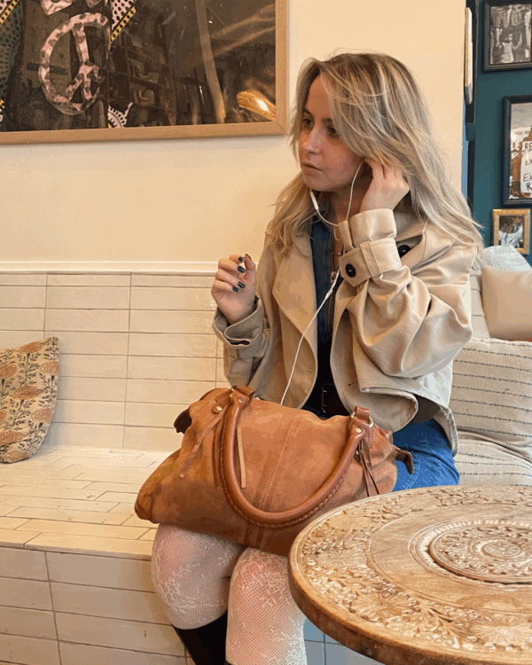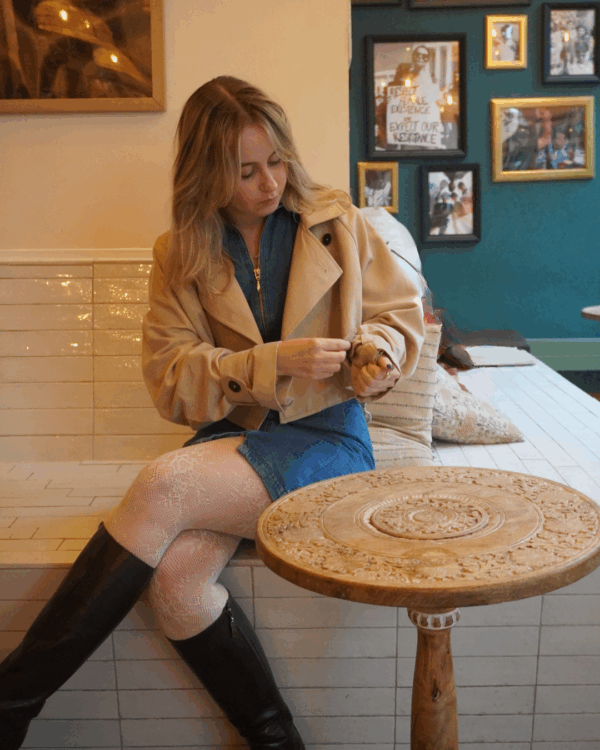 Franzi trägt auf dem Foto den Trenchcoat Ella in Größe S. Durch seinen Oversized Schnitt passt dieser einer Größe XS/S. Die Länge am Rückteil gemessen beträgt 49 cm und schließt somit perfekt in der Linie der Taille ab.